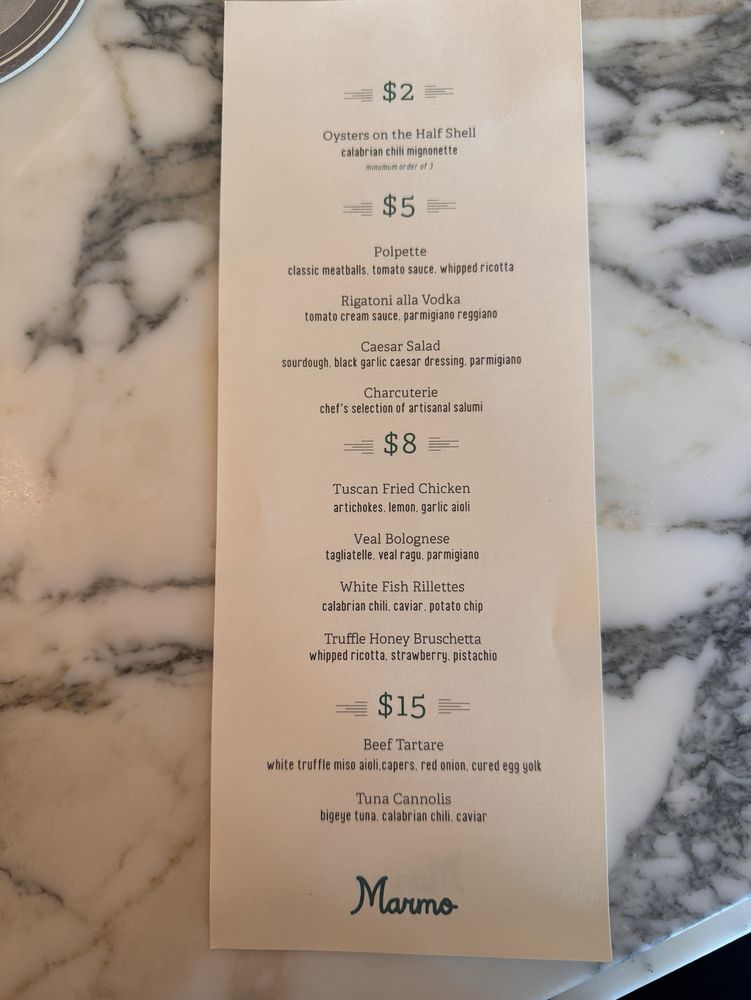 Customer reviews rave about the delicious food and top-notch service at Marmo. From Tuscan fried chicken to tuna cannolis, the menu offers a blend of traditional Italian flavors with a modern twist. Portions are generous, and the option for half-size portions adds a thoughtful touch.